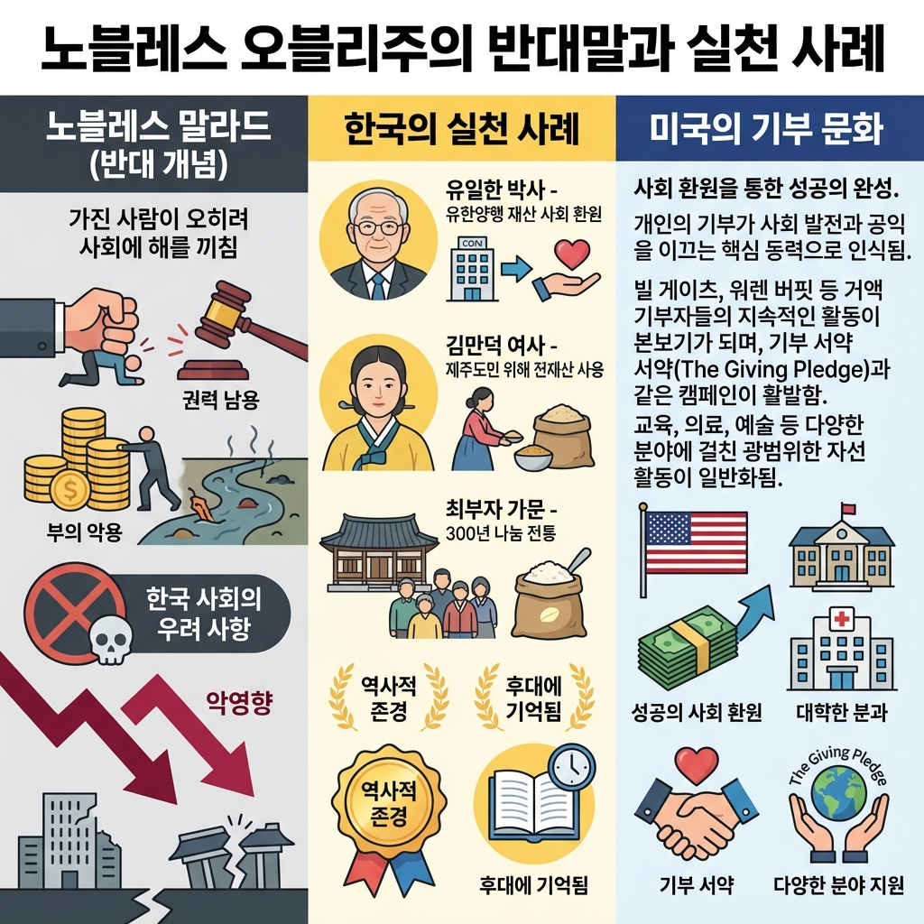반대 개념이 있어요. 노블레스 말라드라고 해서 가진 사람이 더한다는 뜻이에요. 권력과 부를 가진 사람이 오히려 사회에 해를 끼치는 경우를 말해요. 요즘 한국 사회에서 자주 보이는 현상이라고 해요. 저도 이런 뉴스를 보면 안타깝더라고요.