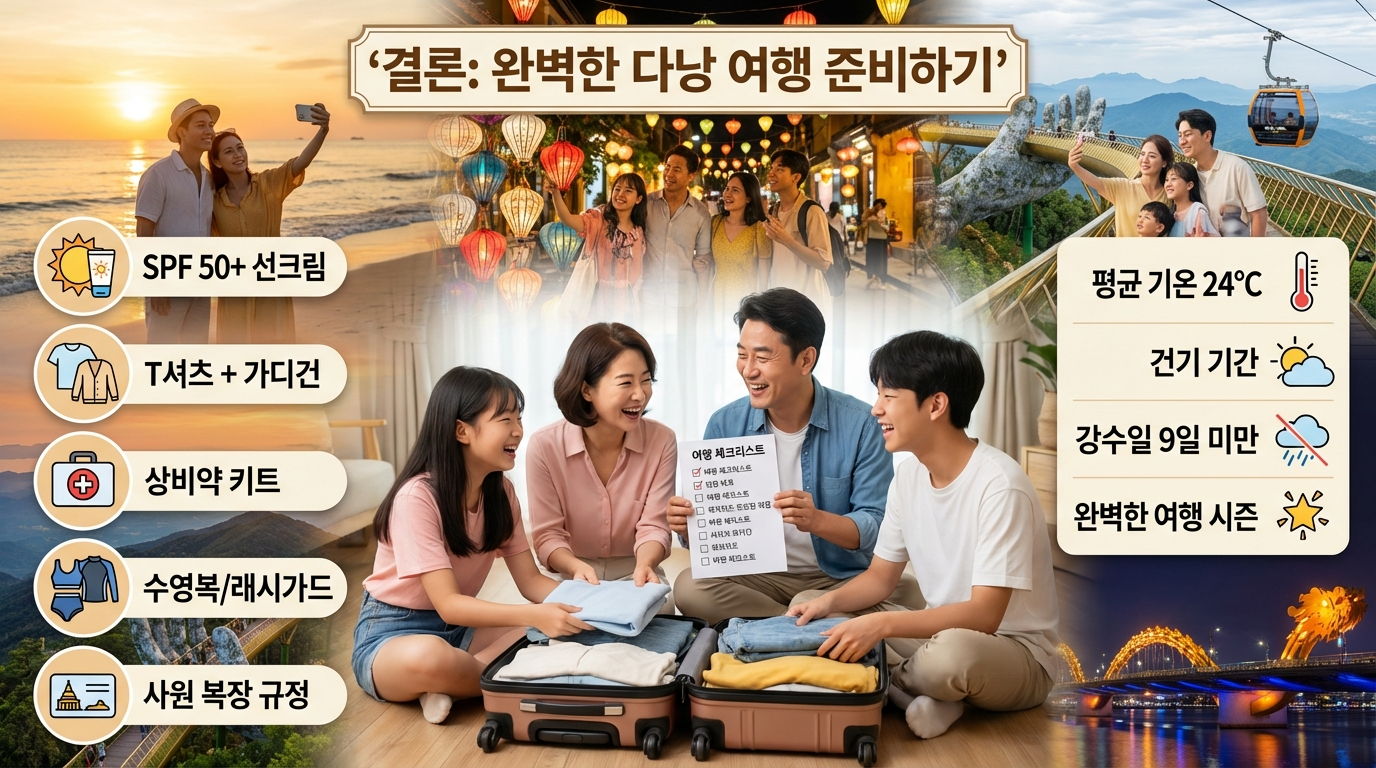 1월 다낭은 정말 매력적인 여행지예요. 추운 겨울을 벗어나 따뜻하고 쾌적한 날씨에서 가족과 소중한 시간을 보낼 수 있어요. 기본적인 옷차림과 준비물만 챙기면 예상치 못한 불편함을 충분히 대비할 수 있답니다. 자외선 차단과 저녁 외투, 그리고 약간의 상비약이 있으면 편하고 안전한 여행을 즐길 수 있을 거예요. 앞으로 펼쳐질 다낭의 아름다운 비치, 맛있는 음식, 그리고 따뜻한 햇빛 속에서 행복한 추억을 만드세요!