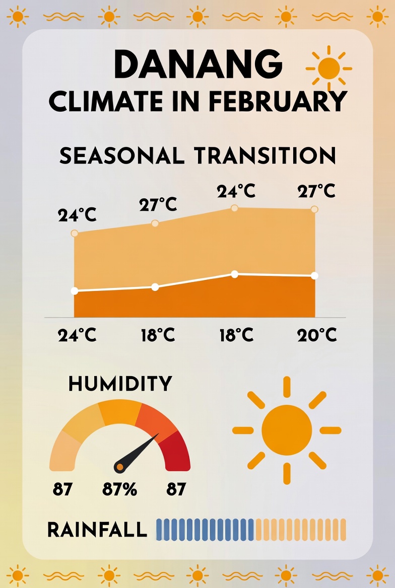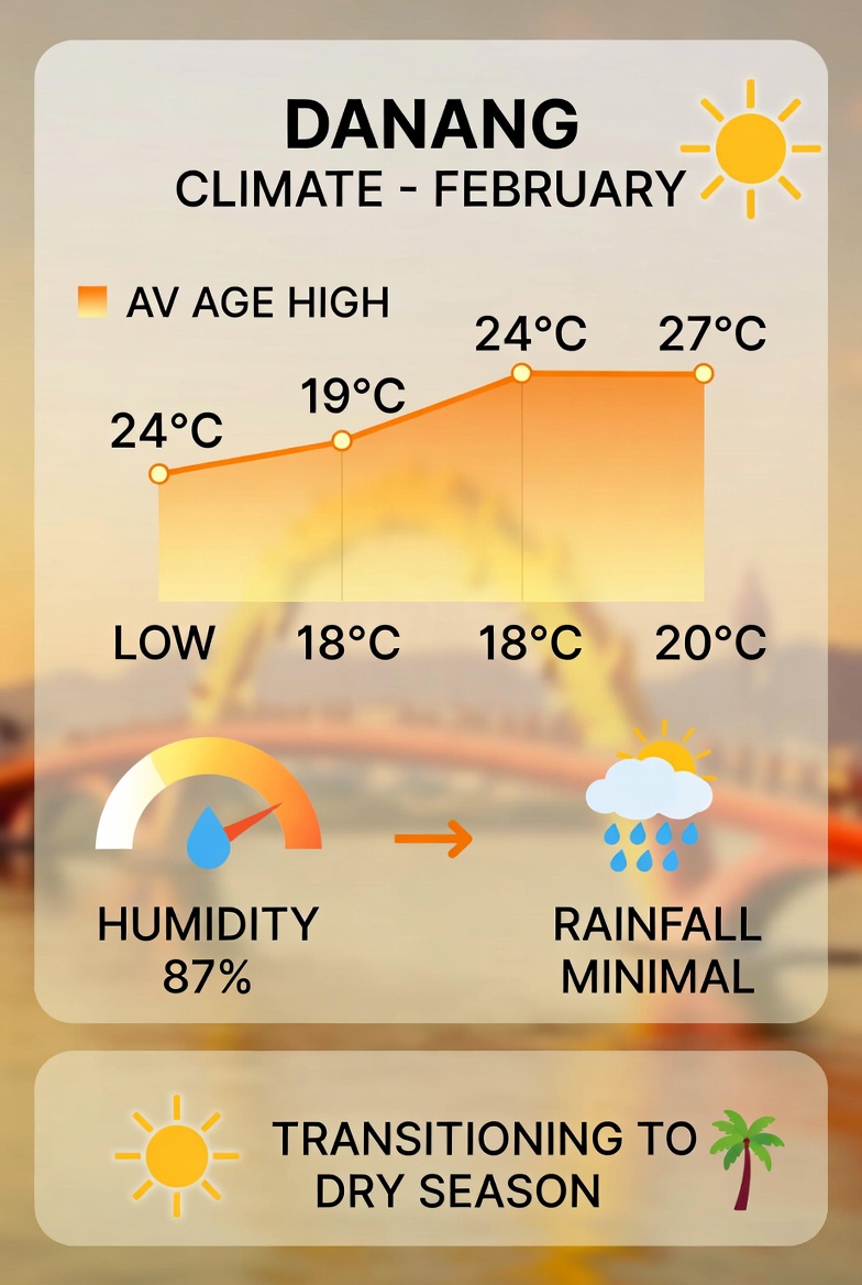 2월 다낭은 평균 최고기온 24~27°C, 최저기온 18~20°C 정도를 기록합니다. 습도는 약 87% 정도로 높지만, 강수량이 거의 없어 쾌적한 야외활동이 가능합니다. 특히 1월보다 따뜻해져서 한낮에는 29~30°C까지 올라가는 날도 있죠. 🌤️