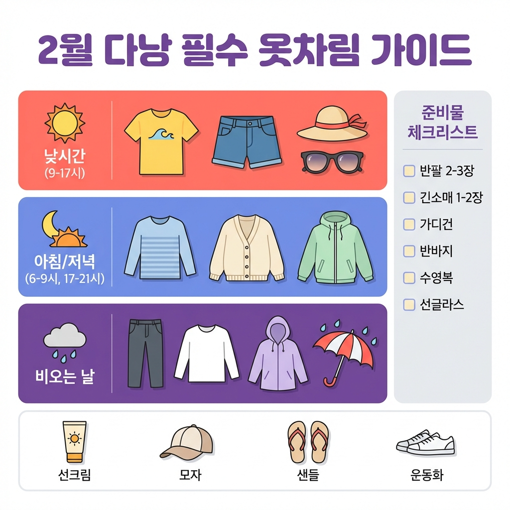 많은 여행객들이 다낭을 "항상 더운 곳"으로 생각하지만, 2월에는 한국의 봄, 가을 날씨를 연상하시면 됩니다. 낮에는 반팔과 반바지로 충분하지만, 아침저녁으로는 쌀쌀하기 때문에 가디건이나 얇은 긴소매가 필수예요. 📍