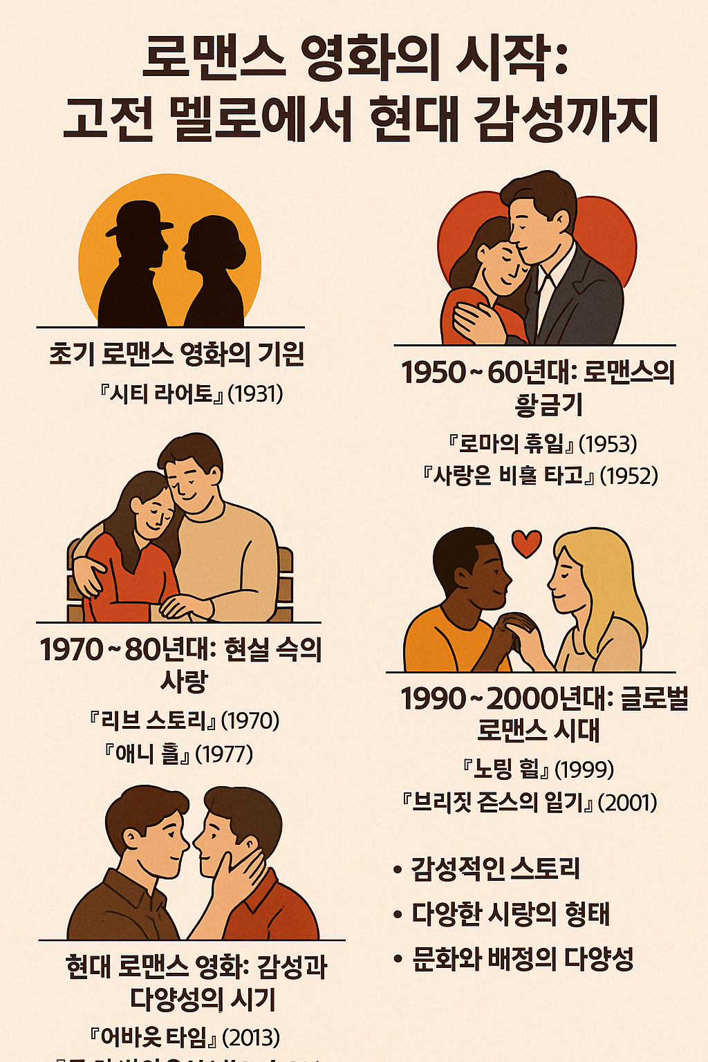 로맨스 영화는 시대와 세대를 넘어 우리 삶의 감정을 가장 진하게 담아내는 장르예요. 저는 개인적으로도 잔잔한 사랑 이야기에 마음이 움직이는 순간들이 많았는데요, 오늘은 로맨스 영화의 기원부터 현재까지의 흐름을 쭉 따라가 보려 해요. 클래식한 작품부터 요즘 감성의 힐링 멜로까지, 읽고 나면 꼭 한 편 보고 싶어질지도 몰라요!