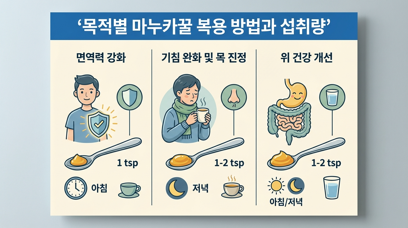 마누카꿀 복용법 - 목적별 섭취 가이드 비교표