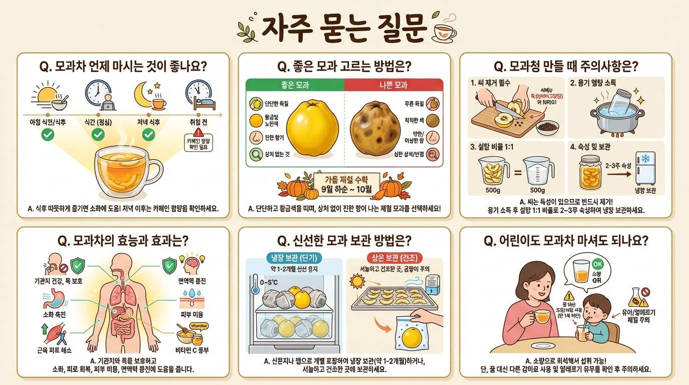 모과차는 아침이나 오후에 마시는 것이 가장 좋습니다. 저녁 늦게 마시면 각성 효과로 수면을 방해할 수 있으므로 피하는 것을 권장합니다. 특히 피로를 느낄 때나 감기 증상이 있을 때 따뜻한 모과차 한 잔이 효과적입니다. 하루 1~2잔이 적당합니다.