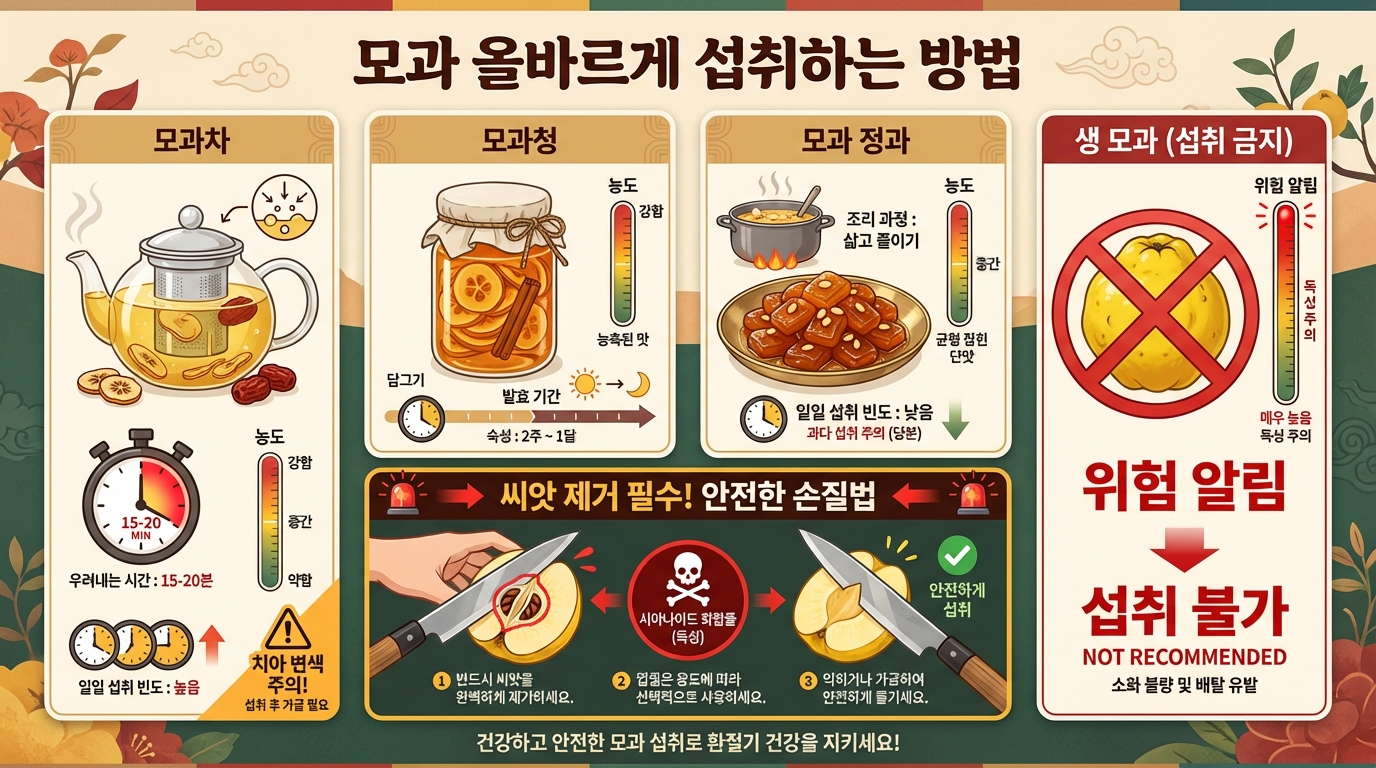 모과는 산도가 높기 때문에 생으로 섭취하면 치아 법랑질을 손상시킬 수 있습니다. 반드시 차나 청으로 가열하거나 가공하여 섭취해야 합니다. 또한 모과차를 마신 후에는 입을 헹굼으로써 치아 부식을 예방할 수 있습니다.