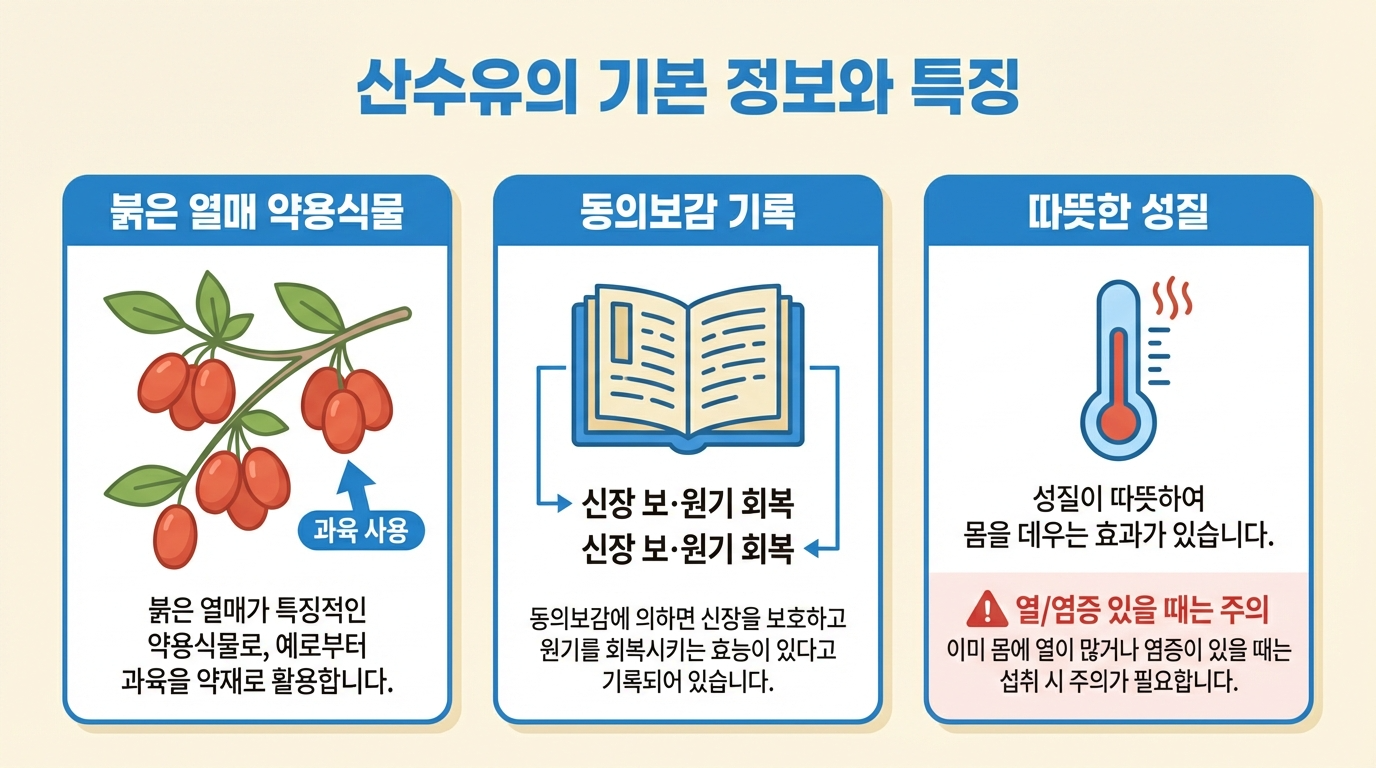 산수유는 신장 건강에 도움을 줄 수 있는 전통 약재예요. 코르닌, 타닌, 사포닌 등의 성분이 풍부하게 함유되어 있어 신장 기능 개선과 기력 회복에 도움을 볼 수 있다고 알려져 있어요. 다만 체질에 따라 적합성이 다르고 과다복용은 피해야 한다는 점을 기억하세요.