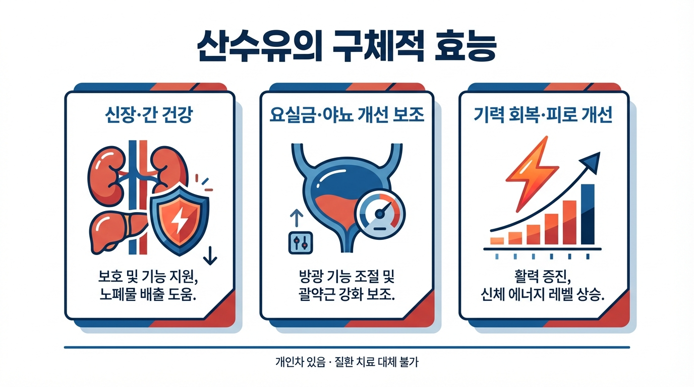 산수유의 가장 유명한 효능은 신장과 간을 보호하고 강화하는 것이에요. 신장 기능이 약해져서 무기력하고 피로한 40대, 50대에게는 정말 필요한 약재예요. 코르닌 성분이 신장의 음(陰)을 보충해서 원기 회복에 도움을 줄 수 있거든요. 저희 삼촌도 신장 기능이 약했는데 산수유를 꾸준히 섭취하니까 체력이 많이 좋아졌다고 했어요.