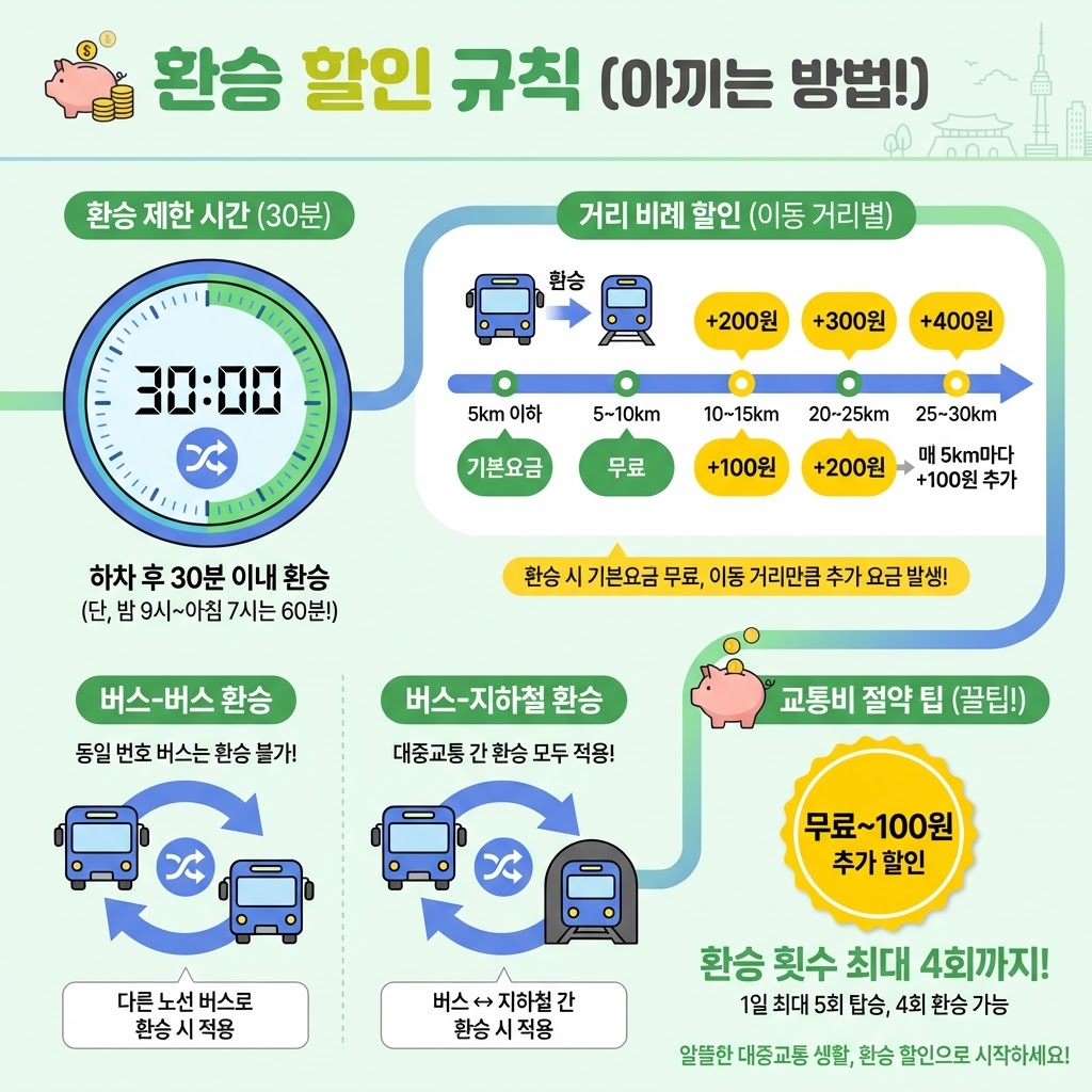 버스에서 버스로, 버스에서 지하철로 갈아탈 때 할인을 받을 수 있어요. 💰 이걸 모르면 손해보는 거랍니다!