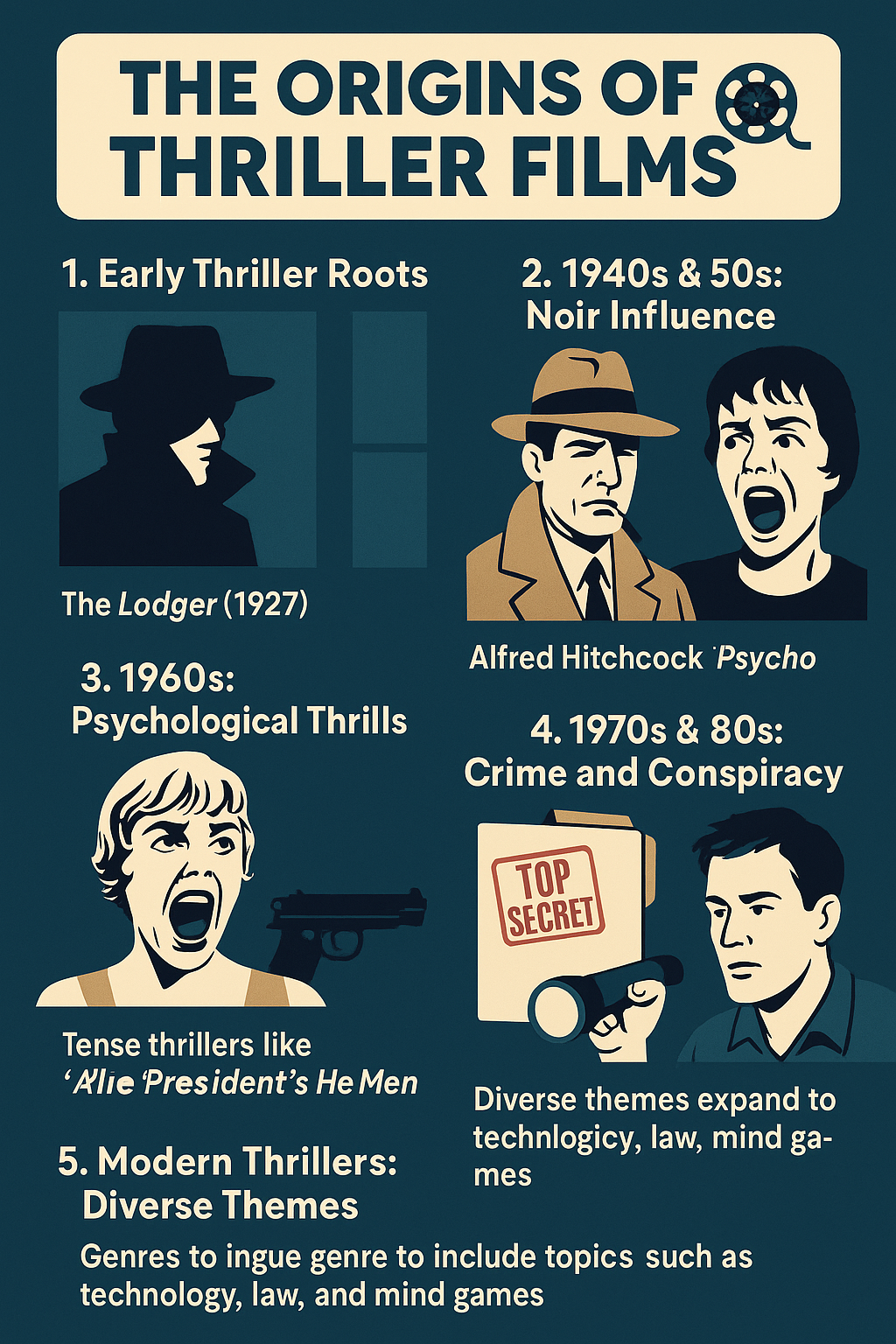 스릴러 영화의 기원은 20세기 초반으로 거슬러 올라갑니다. 초기에는 범죄와 미스터리를 중심으로 한 영화들이 제작되었으며, 알프레드 히치콕 감독의 작품들이 스릴러 장르의 발전에 큰 영향을 미쳤습니다. 그의 영화들은 관객의 심리를 자극하는 서스펜스 연출로 유명합니다.