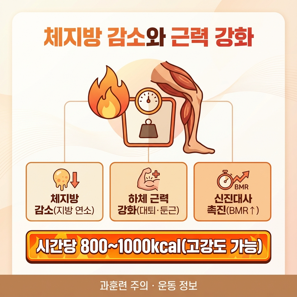 강도를 높이면 시간당 600~700칼로리까지 소모 가능해 체중 감량에 매우 효과적입니다.