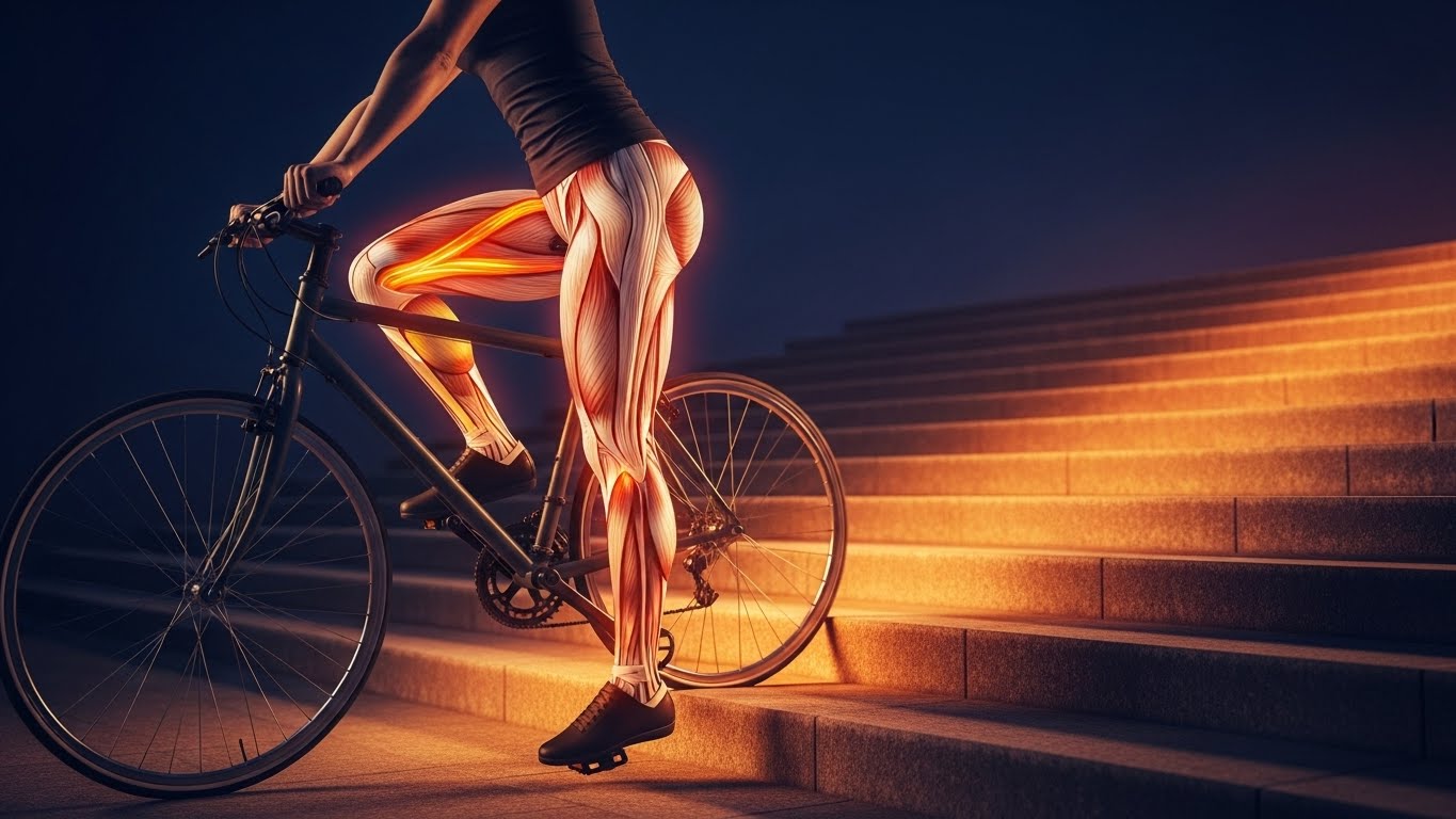 페달을 밟는 과정에서 대퇴사두근, 종아리, 엉덩이 근육이 지속적으로 활동해요.