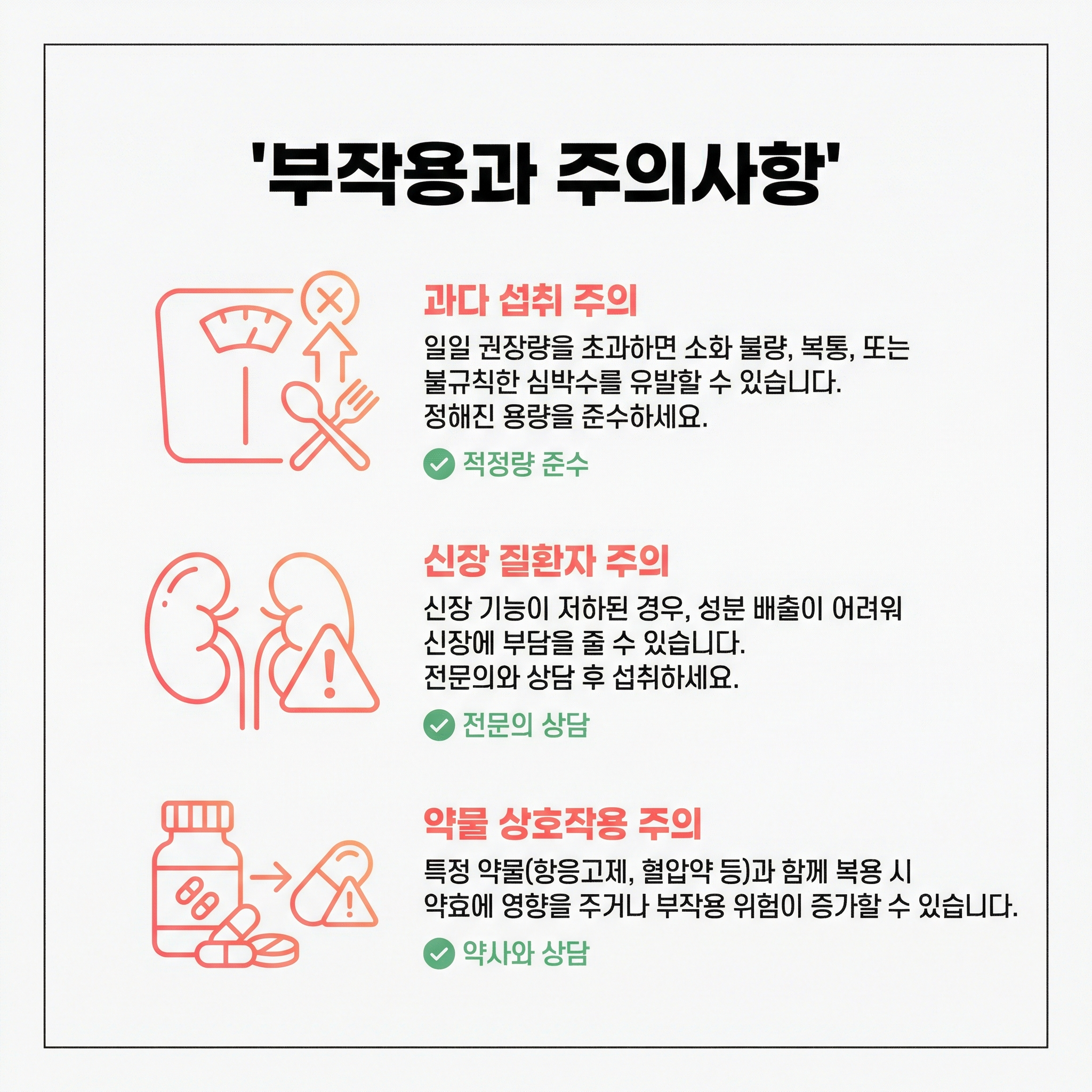칼륨이 720mg이나 들어있어서 신장 기능이 약한 분들은 칼륨 배출이 어려울 수 있어요. 신장 투석을 받으시거나 만성 신부전이 있으신 분들은 의사와 상담 후 드세요!