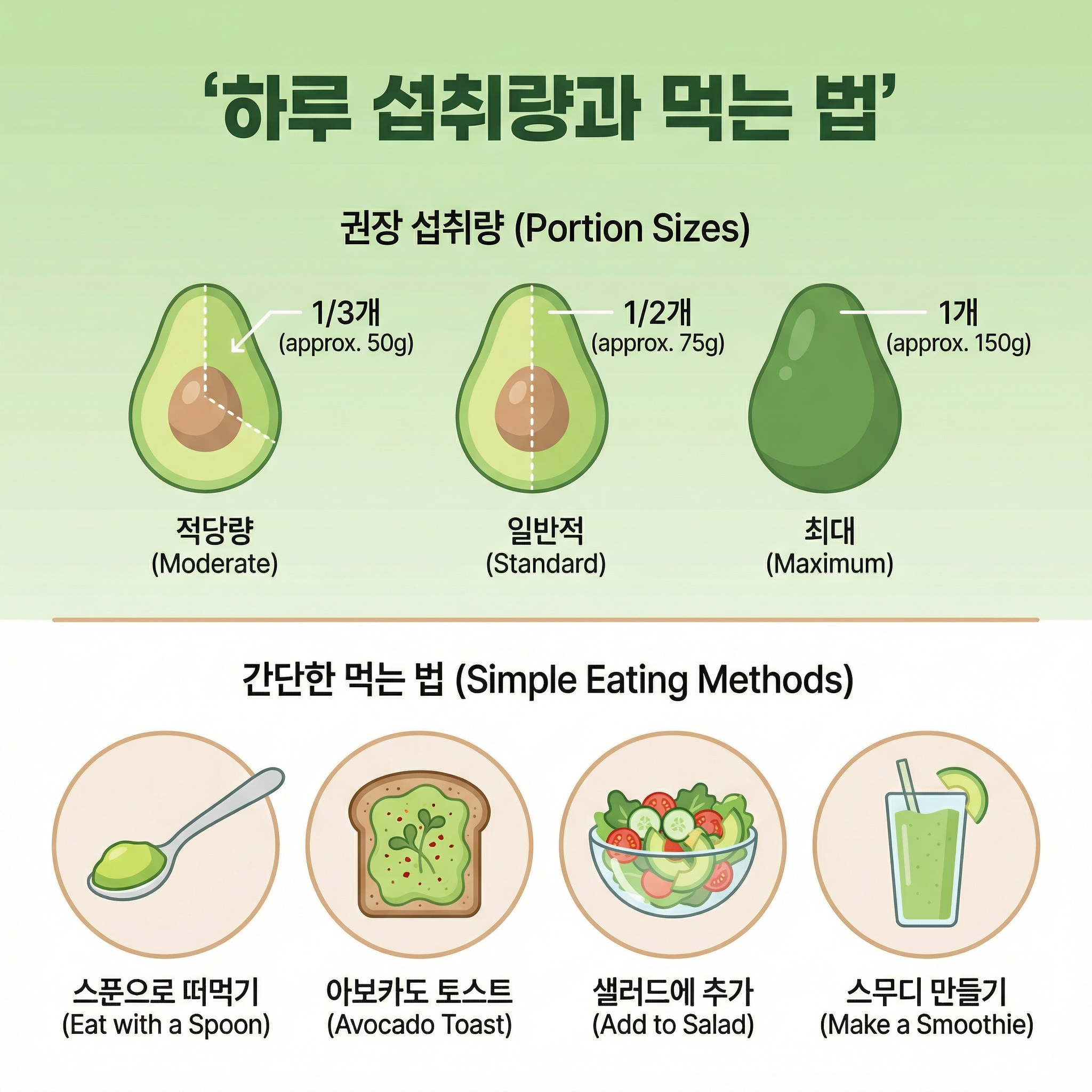 아보카도는 칼로리가 높아서 과다 섭취하면 오히려 살이 찔 수 있어요. 하루 1개 이상은 먹지 않는 게 좋고, 다이어트 중이라면 1/3개 정도만 드세요. 적당량을 지키는 게 가장 중요해요!