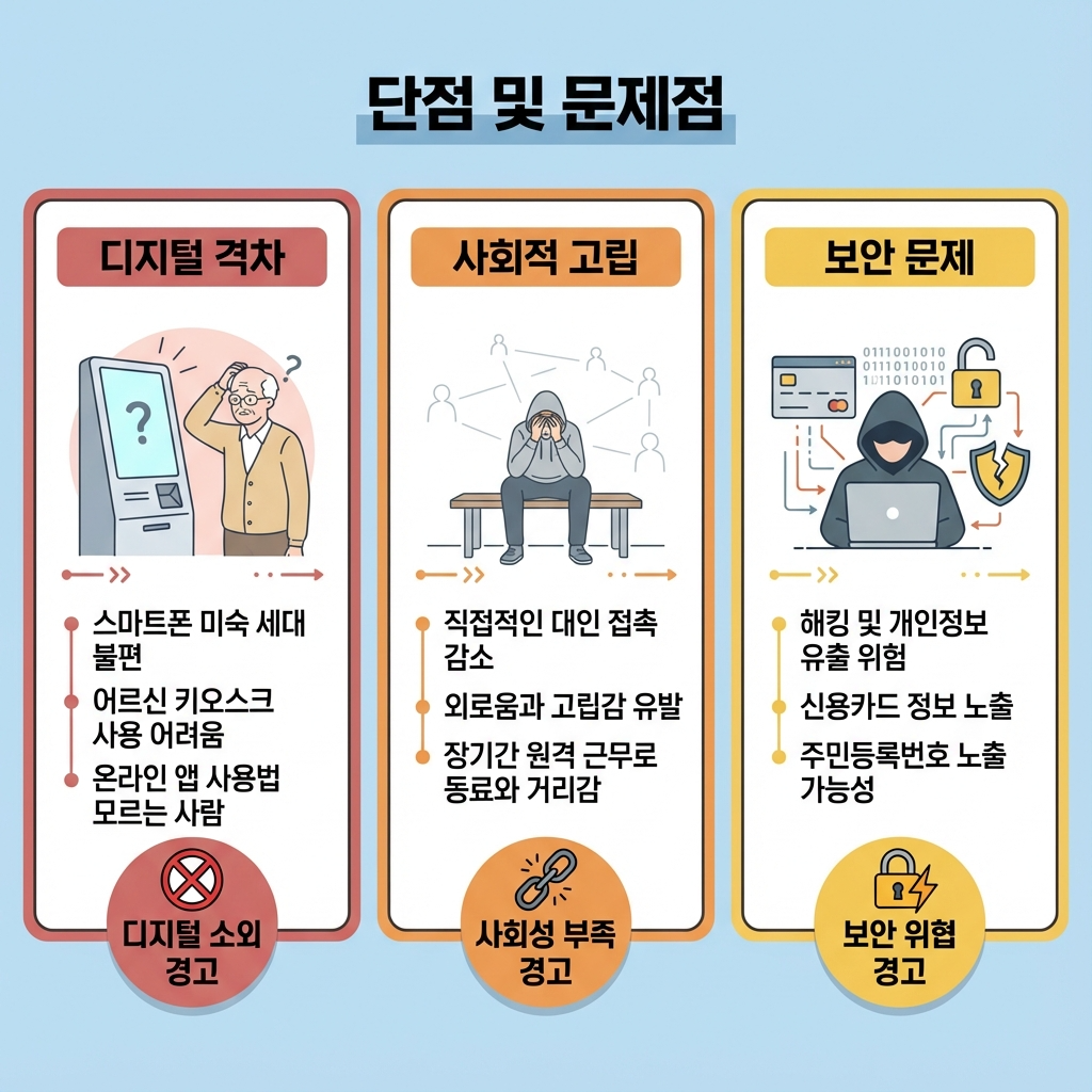 언택트 서비스를 모든 사람이 동등하게 이용할 수 있는 건 아니에요. 스마트폰이나 컴퓨터를 능숙하게 다루지 못하는 세대에게는 오히려 불편할 수 있어요. 특히 고령층이 키오스크 앞에서 막막해하는 모습을 자주 봐요. 저도 친구 부모님께서 온라인 은행 앱 사용법을 물어보셨을 때 직접 설명해 드려야 했어요.