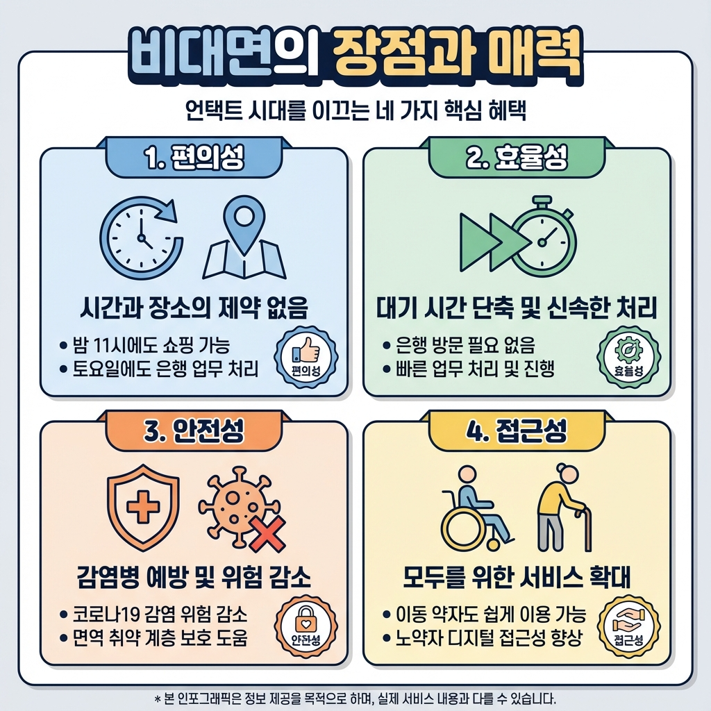 언택트 서비스의 가장 큰 매력은 시간을 절약할 수 있다는 거예요. 예전처럼 은행을 가서 줄을 서거나, 쇼핑몰에서 점원을 찾을 필요가 없어요. 퇴근 후 밤 11시에 편의점 앱으로 물건을 주문해도 새벽에 배달받을 수 있어요. 저도 요즘 은행 가는 일이 거의 없어졌는데, 그전에 주민등록등본 하나 받으려고 은행을 일일이 방문해야 했던 일들을 생각하면 정말 편해졌다고 느껴요.