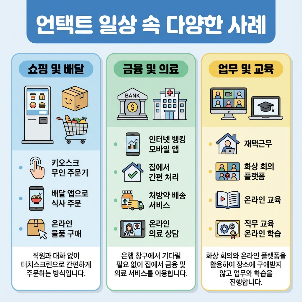 재택근무, 화상 회의, 온라인 교육 같은 것들도 모두 언택트의 좋은 예예요. 사무실에 출근하지 않고 집에서 일하면서 화상 회의 플랫폼(줌, 팀즈 등)으로 동료들과 소통해요. 학교도 온라인 수업이 가능해졌고, 직업 교육도 인터넷으로 배울 수 있게 됐어요. 직접 해보니 시간을 절약할 수 있다는 게 정말 큰 장점이더라고요.