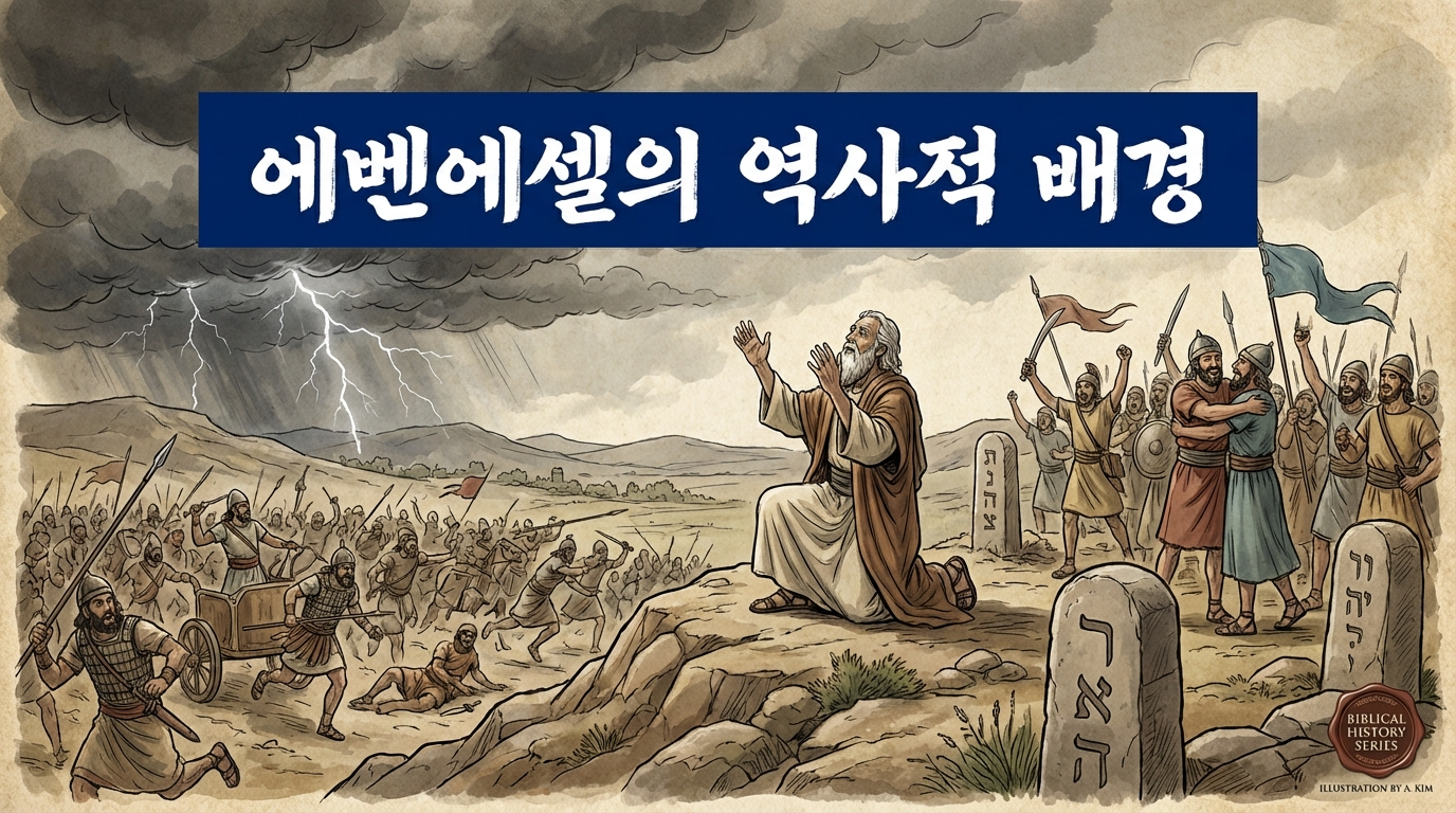 에벤에셀이 등장하는 사무엘상 7장은 이스라엘이 블레셋과의 전쟁에서 위기에 처해 있던 시대를 배경으로 합니다. 사무엘상 4장에서 이스라엘은 블레셋과의 전투에서 참담하게 패배했고, 하나님의 언약궤까지 빼앗겼어요. 하지만 7장에서 사무엘의 중보기도와 이스라엘의 회개를 통해 하나님은 천둥으로 블레셋 군대를 무너뜨리시고, 이 승리를 기념하기 위해 돌을 세운 것입니다.