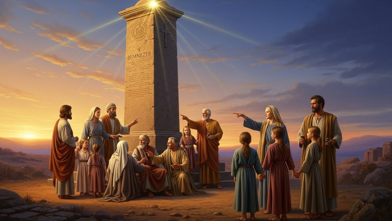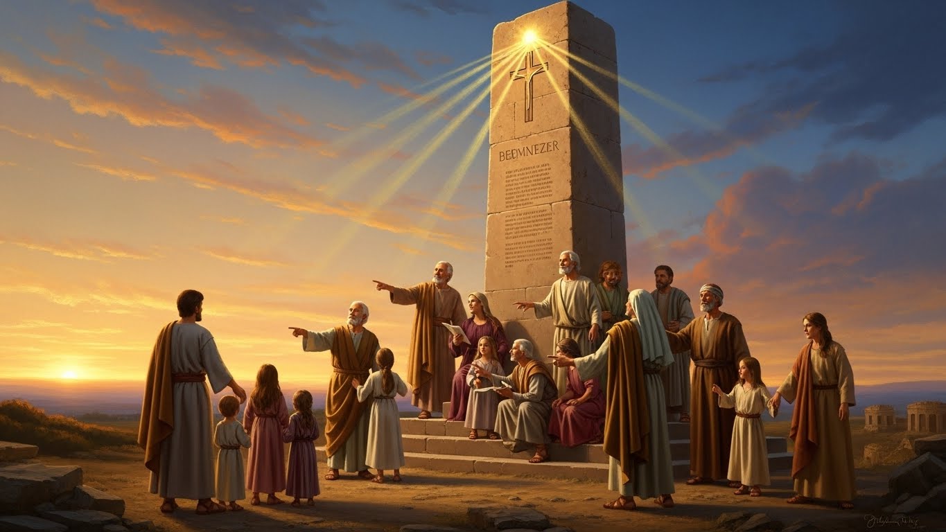 📖 에벤에셀(Ebenezer)은 히브리어로 "도움의 돌"이라는 뜻입니다. 이는 하나님이 이스라엘 백성을 지금까지 어떻게 도우셨는지를 기념하는 의미로, 사무엘상 7장 12절에서 처음 등장합니다. 절망 속에서도 하나님의 은혜로 승리한 경험을 돌에 새겨 후대에 전하는 신앙의 유산이에요.