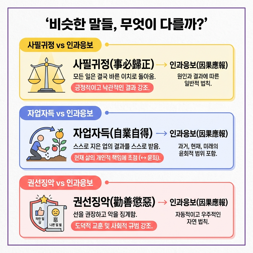 인과응보 뜻과 비슷하지만 약간 다른 표현들이 있어요. 구분해 볼까요?
