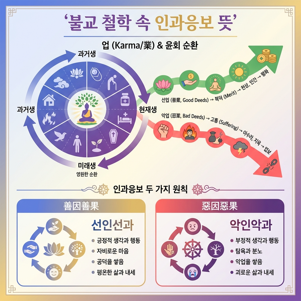 인과응보 뜻은 불교의 핵심 철학 중 하나예요. 불교에서는 이를 단순히 상선벌악의 차원이 아니라, 윤회의 작동원리로 봅니다.