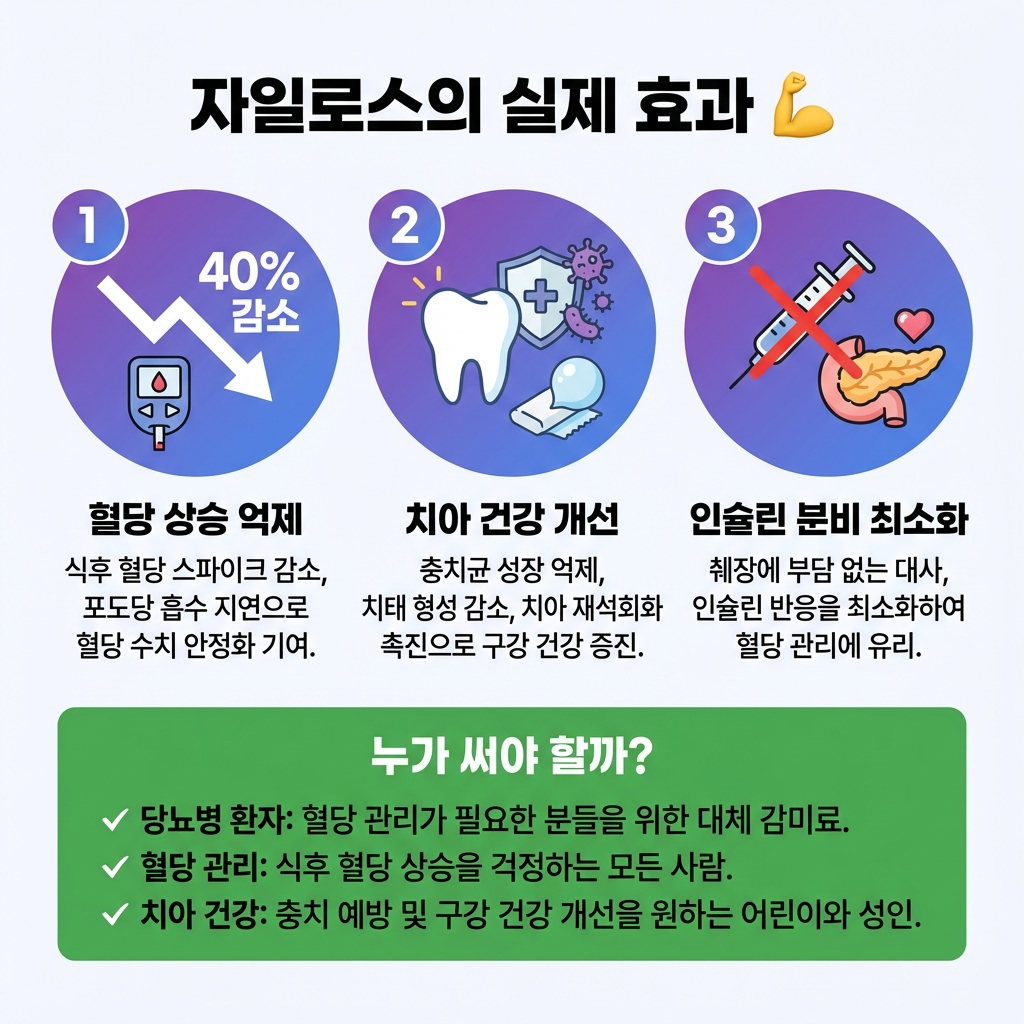 설탕과 자일로스를 10:1 비율로 섭취하면 설탕 흡수가 약 40% 감소합니다. 📉 당뇨병 환자나 혈당 관리가 필요한 사람에게 의미 있는 효과죠!