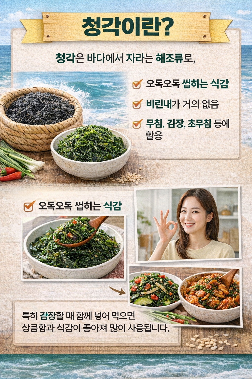 청각은 오돌오돌한 식감이 특징인 해조류로, 김장이나 무침에 자주 쓰입니다.