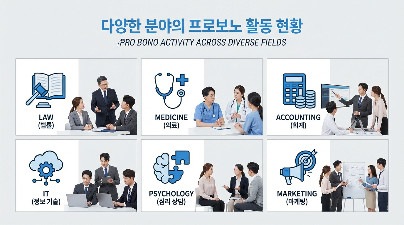 자원봉사는 누구든 참여할 수 있지만, 프로보노는 전문가의 전문 지식을 제공하는 것이 특징이에요. 예를 들어 변호사가 법률 지식 없는 사람들을 위해 무료로 법률 상담을 해주는 것이 프로보노라면, 누구나 할 수 있는 자선 활동은 일반 자원봉사입니다. 전문성이 프로보노의 핵심 가치라고 할 수 있어요.