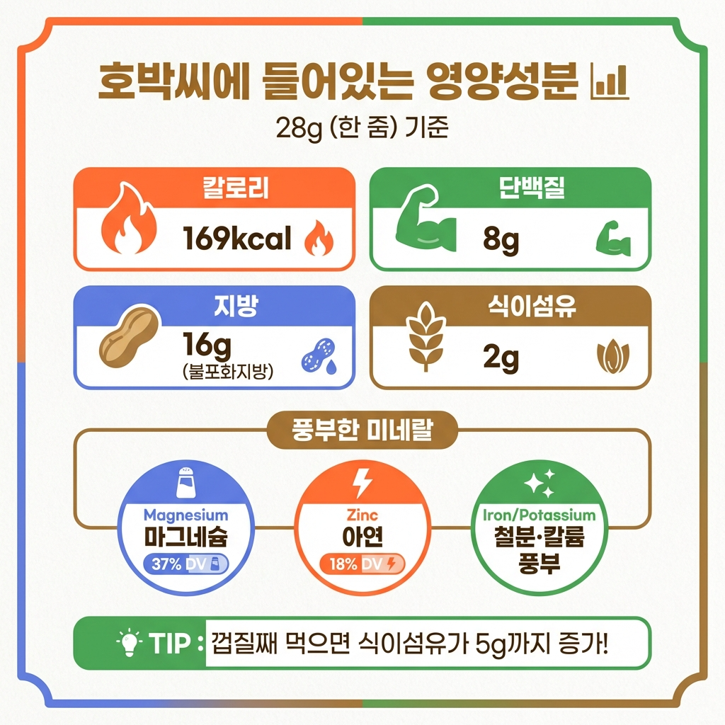 호박씨는 작지만 영양소가 정말 다양하게 들어있어요. 📊 특히 단백질과 건강한 지방이 풍부해서 간식으로 제격이죠.