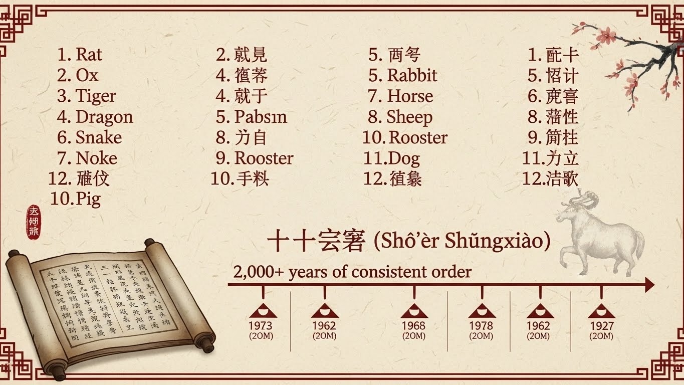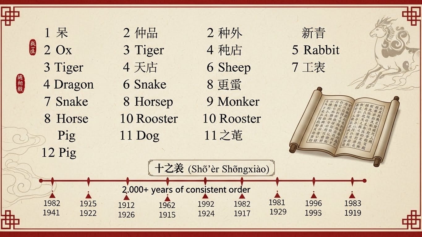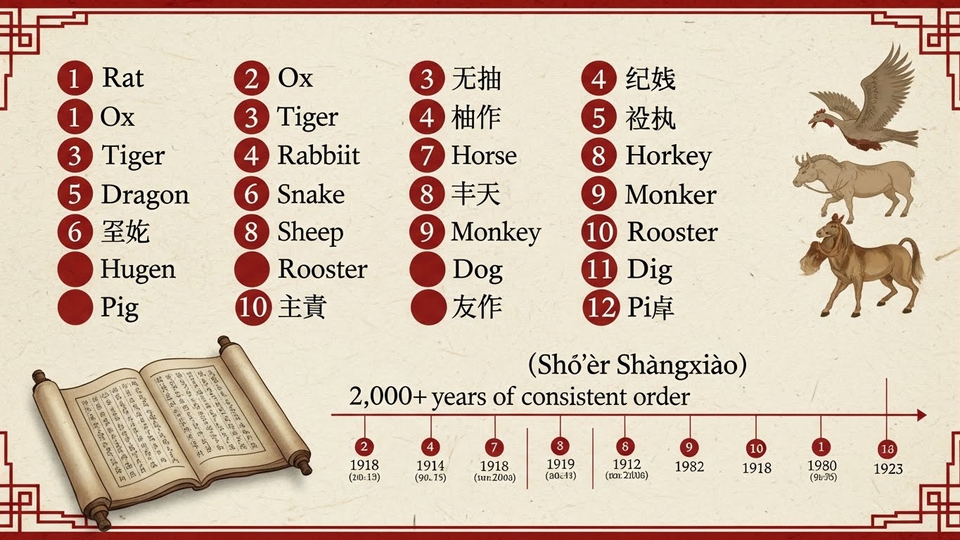 1번 쥐띠, 2번 소띠, 3번 호랑이띠, 4번 토끼띠, 5번 뱀띠, 6번 말띠, 7번 양띠, 8번 원숭이띠, 9번 닭띠, 10번 개띠, 11번 돼지띠, 그리고 12번째가 다시 쥐띠로 돌아온답니다. 이 순서는 중국 고전 문헌인 '십이지'에서 비롯되었고, 2000년 이상 변하지 않고 전해져 내려왔어요.