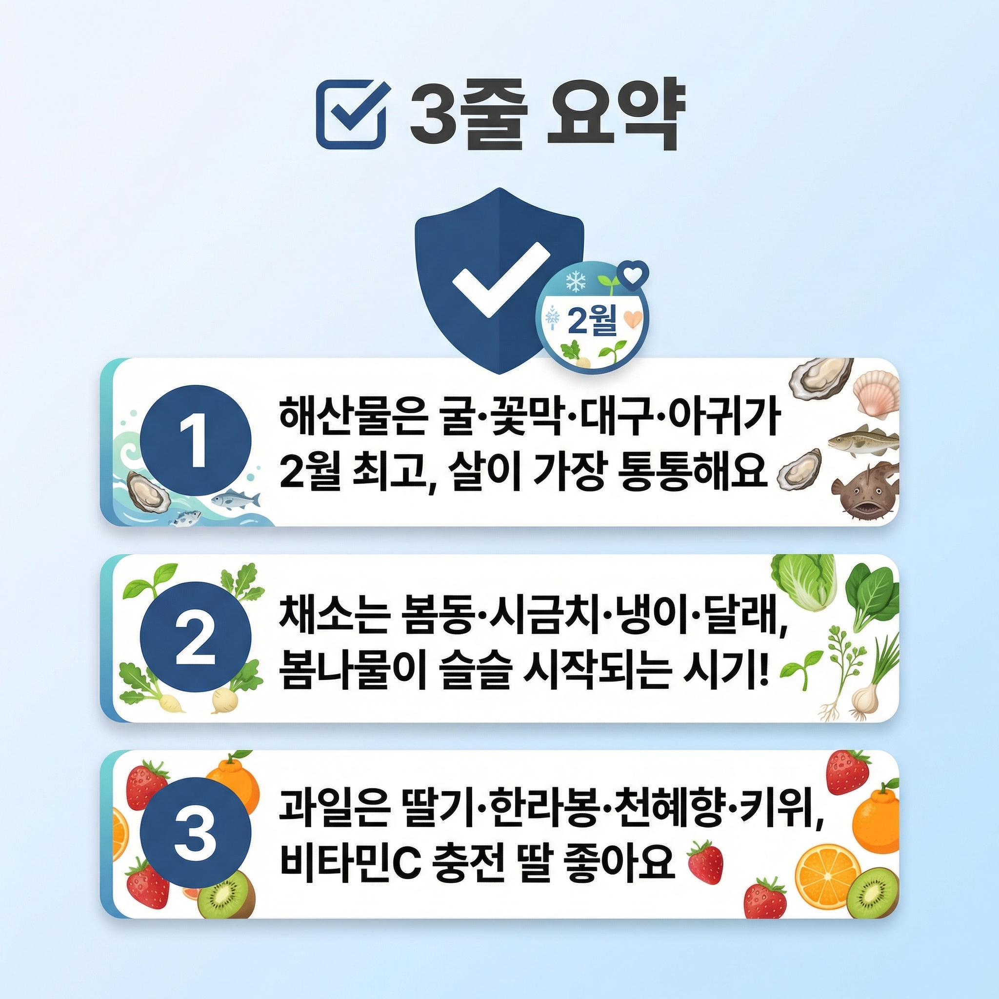 지금 제철인 식재료만 잘 골라도 맛도, 영양도 두 배! 3분이면 2월 제철 음식 총정리, 시작할게요. 😋