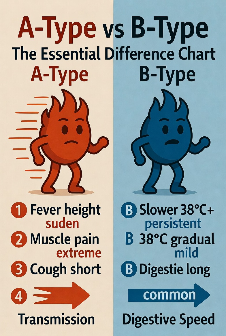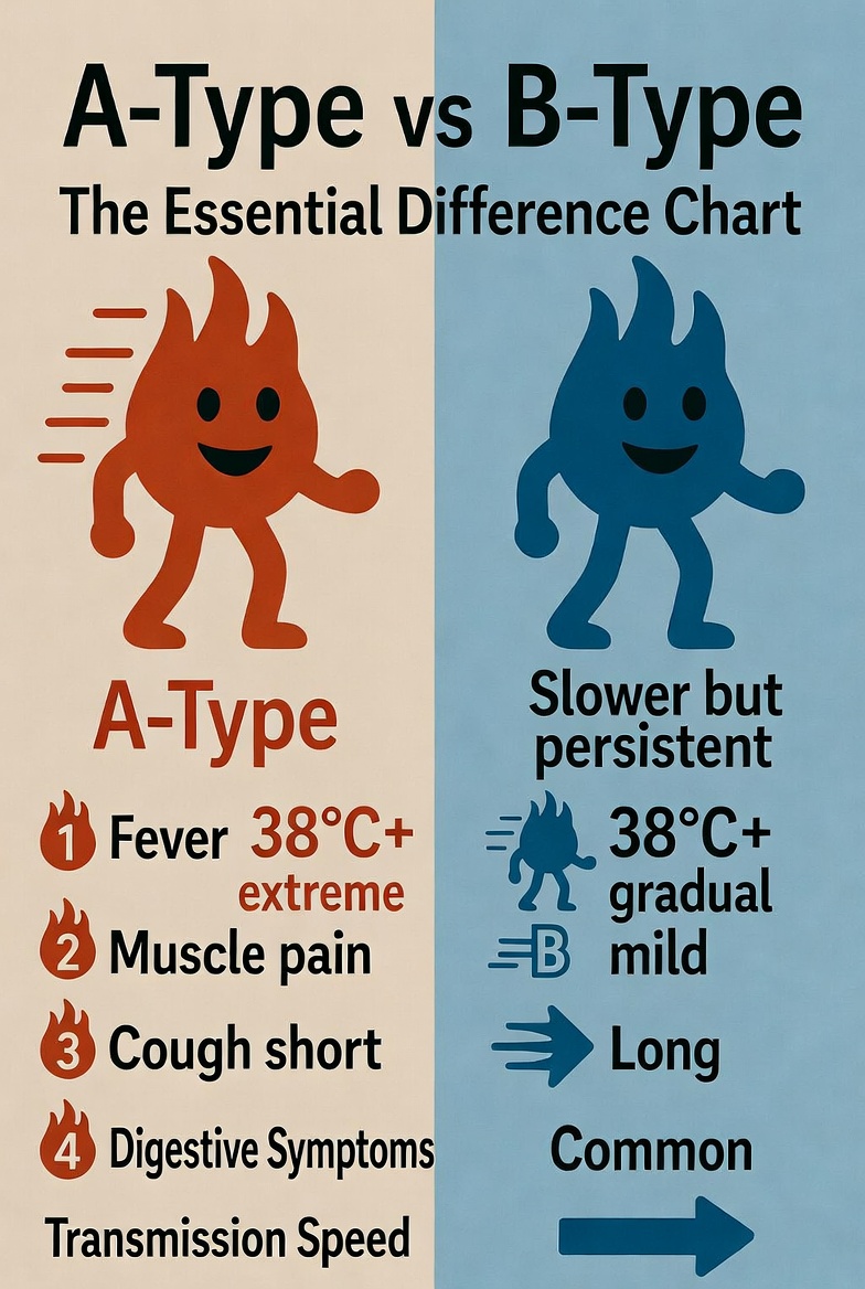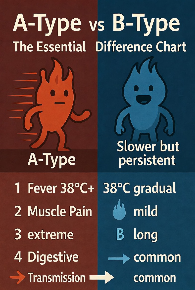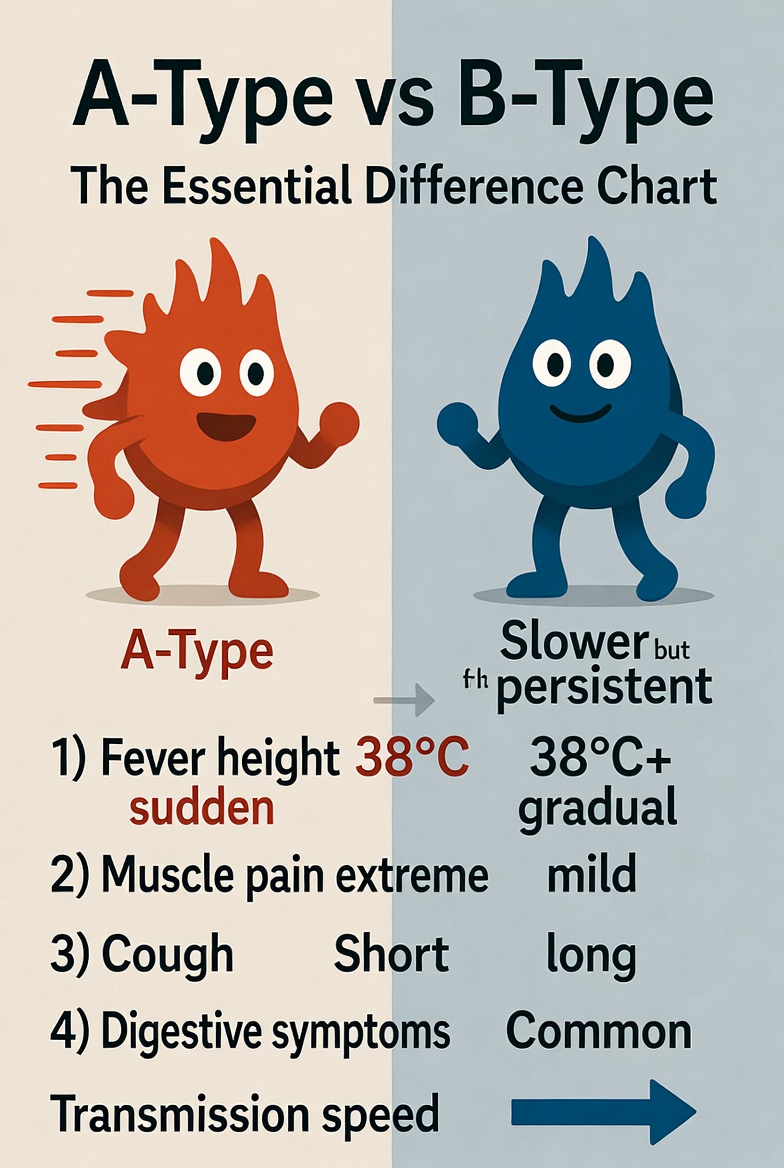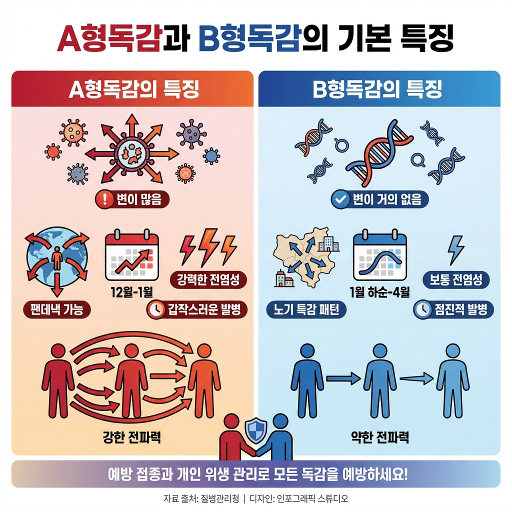 A형독감은 높은 열과 심한 근육통이 특징이고 감염력이 강해요. 반면 B형은 증상이 약하지만 기침이 오래 지속되고 소화기 증상을 동반하기도 합니다. 유행 시기도 다르고 변이도 차이가 있어요.