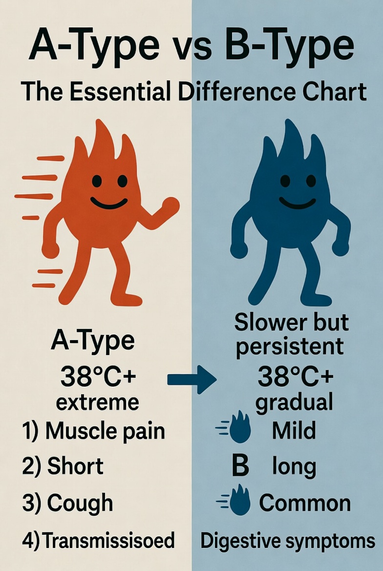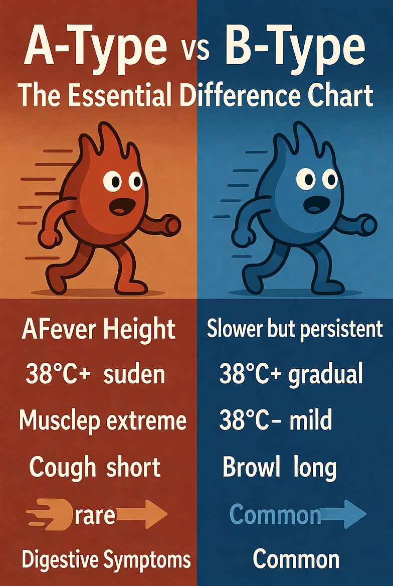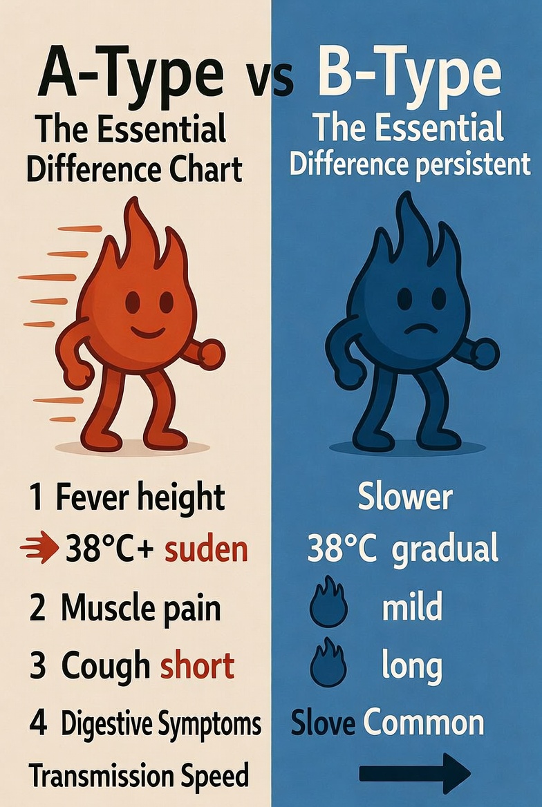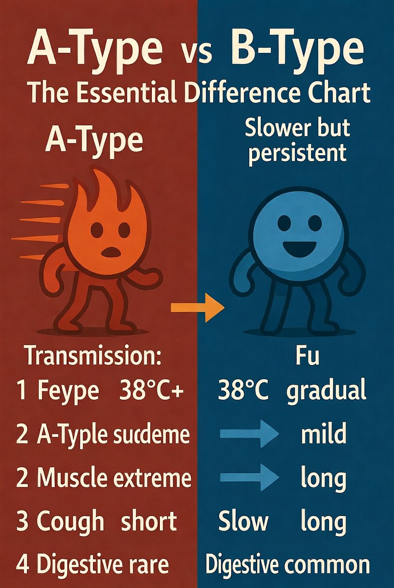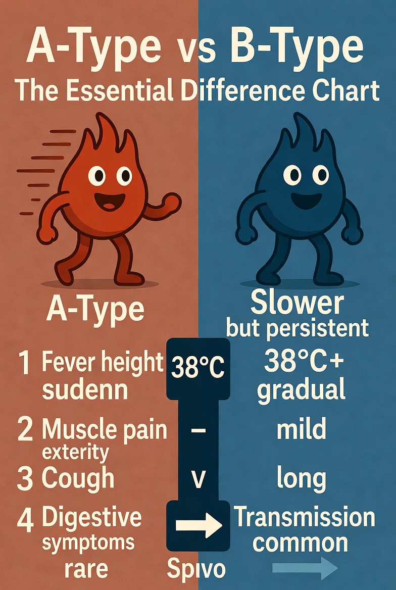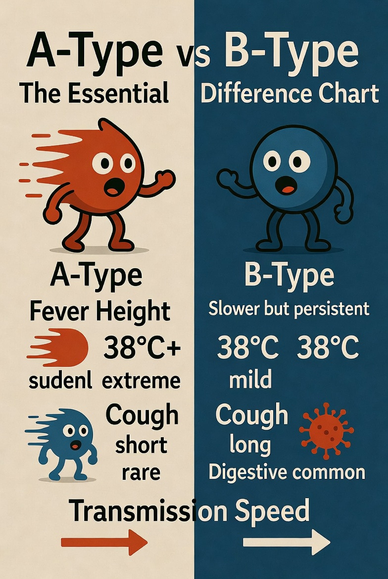 A형독감은 높은 열과 심한 근육통이 특징이고 감염력이 강해요. 반면 B형은 증상이 약하지만 기침이 오래 지속되고 소화기 증상을 동반하기도 합니다. 유행 시기도 다르고 변이도 차이가 있어요.